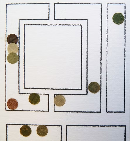 The plant leaves on display are protected by a plastic sheet and arranged on shelves in a disorderly manner emphasizing their differences. On the sketch of the cemetery grounds the artists’ locations are marked with the references of the 40 species collected.