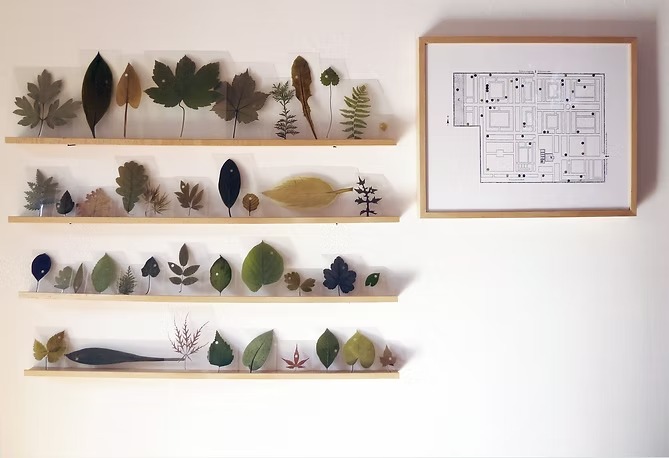 Herbarium, maple wood shelves and frame, print on Hahnemühle paper, collage. 150x150x 5 cm