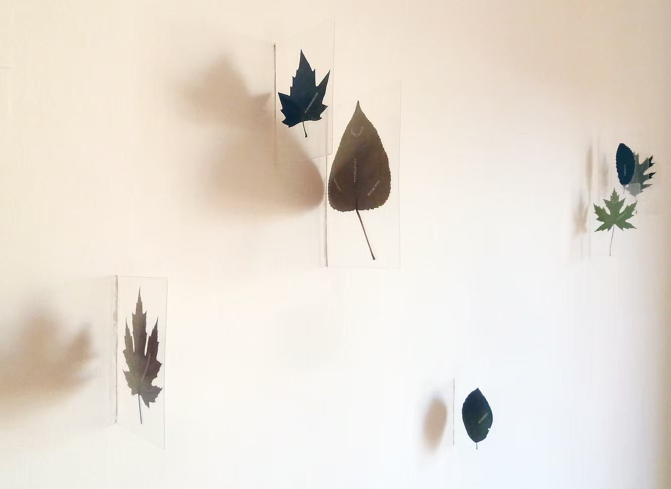Installation. Pressed tree leaves: birch, elm, ash, alder, beech, oak, linden, poplar, chestnut, walnut, London plane, maple,… ; Letraset.