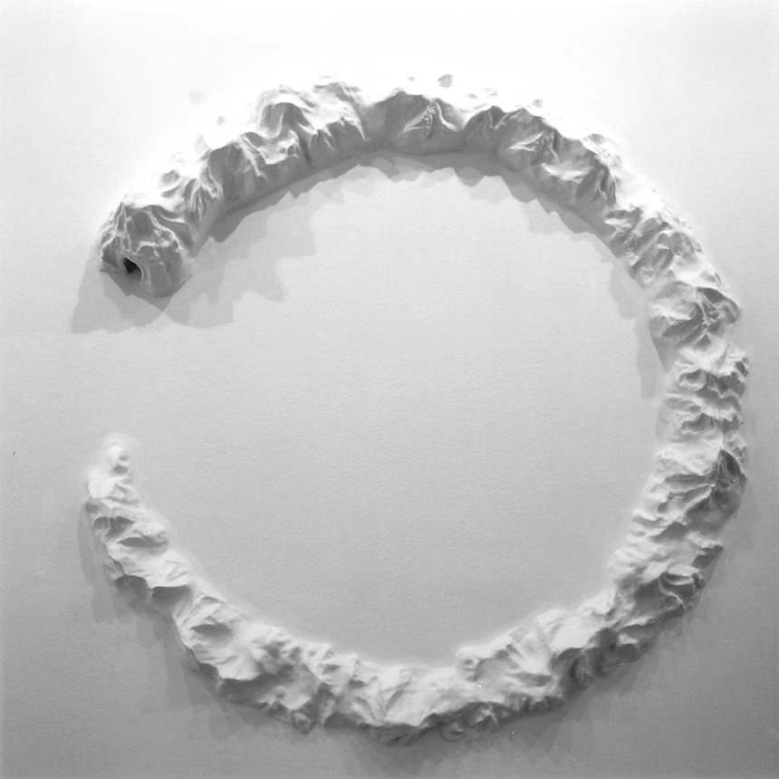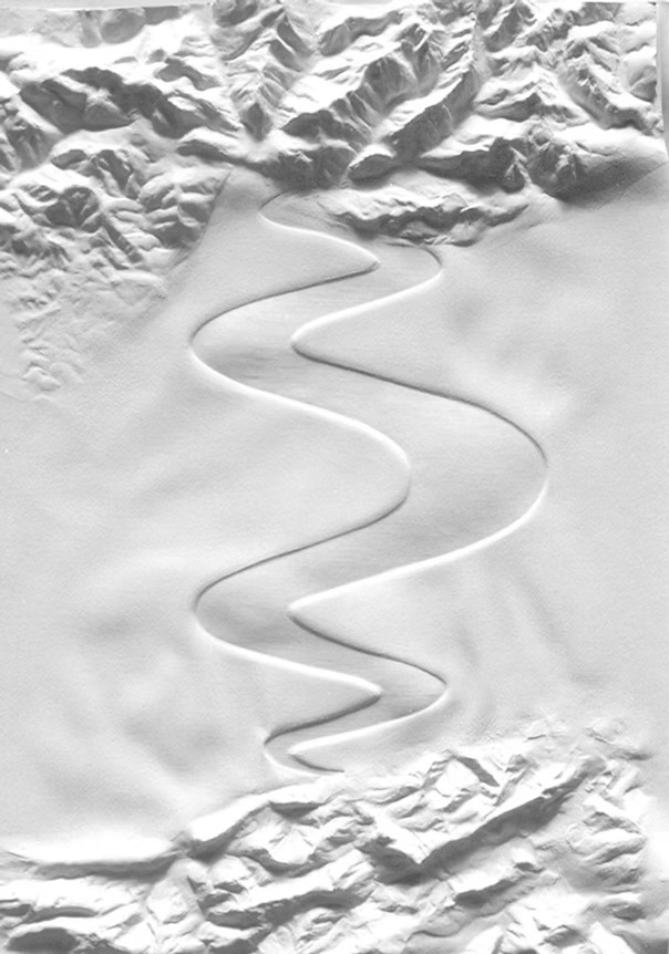 Landscapes purified, distilled, almost theoretical, materialized only by drawing space. Landscapes modelled directly on the fragile support of the paper or on the steep wall surface. White surfaces addressed as areas of light, where subtly landscapes are modelled in the form of relief maps.